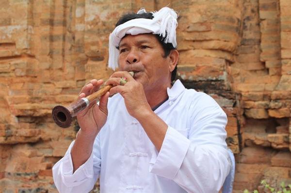 (Nghệ nhân Chăm dưới chân tháp với điệu kèn Sranai)