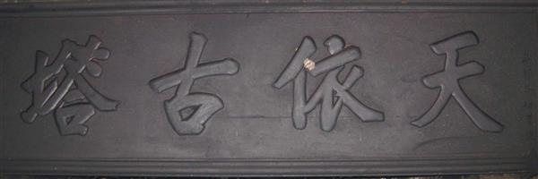 - Hoành phi thứ tư treo trên ngạch cửa ở trong lòng tháp Đông Bắc nhìn từ trong ra, rất khó phát hiện vì ánh sáng tối và bị nhuốm một màu đen do khói nhang bao phủ. Bức này chữ khắc tách nét nên nét mảnh rất khó đọc, tuy nhiên quan sát kỹ vẫn thấy rõ nội dung bốn chữ là: 臨 上 質 傍 - LÂM THƯỢNG CHẤT BÀNG, đại ý: Mẫu lúc nào cũng như đang ở trên cao chứng giám, ở bên phải, bên trái ta vậy. Dòng lạc khoản hiện đã bị mờ.