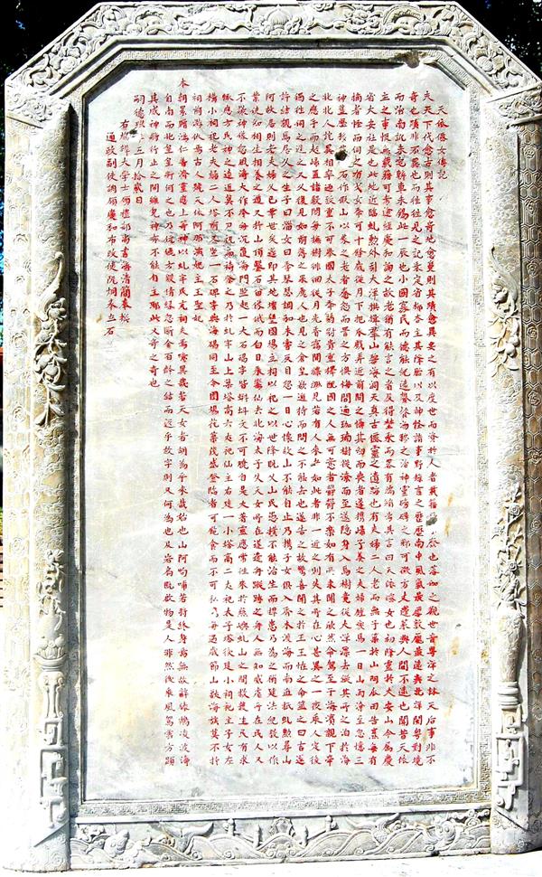 “Núi Cù Lao mạch từ núi Đại An mà ra, tuy tọa lạc nơi miền sông nước, thế mà cái tươi đẹp cất nhắc lên ở các núi, trong việc nhóm họp ấy lại được cái khí của núi là điều riêng lạ. Bên ngoài thì cỏ lau che lấp, bên trong sâu xa thì gồm đủ thăm thẳm u trầm, sương móc cỏ cây. Rõ là thiên nhiên tột bậc có thần ở vậy. Cho nên nói rằng: núi không phải tại cao, có tiên thì nổi danh” (Trích nội dung văn bia).