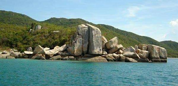 Khi ghe tàu rời bến ra vịnh, từ gần giữa vịnh có một cụm đá sa thạch khổng lồ màu vàng trắng lô nhô trên mặt biển xanh, trông như một cụm hòn non bộ khổng lồ, rất đẹp mắt, tưởng chừng như do chính bàn tay con người dựng nên. Những khối đá này mang nhiều hình thù, kích cỡ khác nhau, trong đó có hai khối đá lớn nhất, cao cả chục mét, vươn cao lên trong thế hơi nghiêng nghiêng, trông chẳng khác nào hòn Phu Tử ở Kiên Giang. Khi tàu chạy vòng quanh cụm đá cho ta những góc nhìn khác nhau rất đẹp và đầy thú vị về cụm non bộ khổng lồ trên vịnh Vân Phong.