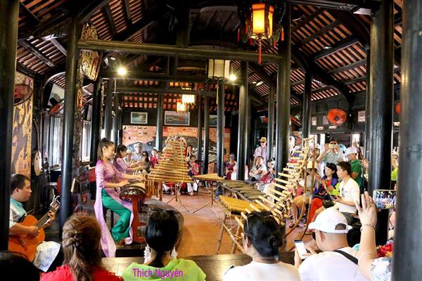 Say lòng du khách: Bước vào không gian Hội quán nơi các nhạc công đang say sưa biểu diễn cho du khách thập phương, chúng tôi rất bất ngờ khi nhìn thấy cả một “gia đình” nhạc cụ dân tộc đang được trưng bày và biểu diễn như đàn đá, đàn bầu, đàn nhị, đàn t’rưng, đàn klông pút, đinh bá, đàn tứ, đàn tranh, trống…