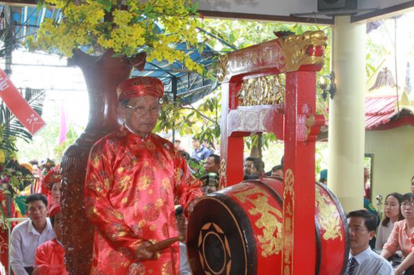 Ông Lương Duy Hinh - Trưởng Ban quản lý di tích Am Chúa đánh trống khai hội