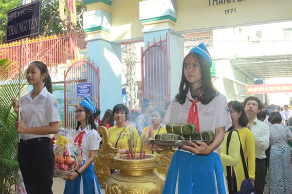 (Giáo viên, học sinh trường THCS Thái Nguyên dâng hoa, lễ vật tưởng niệm Đức Quốc Tổ)