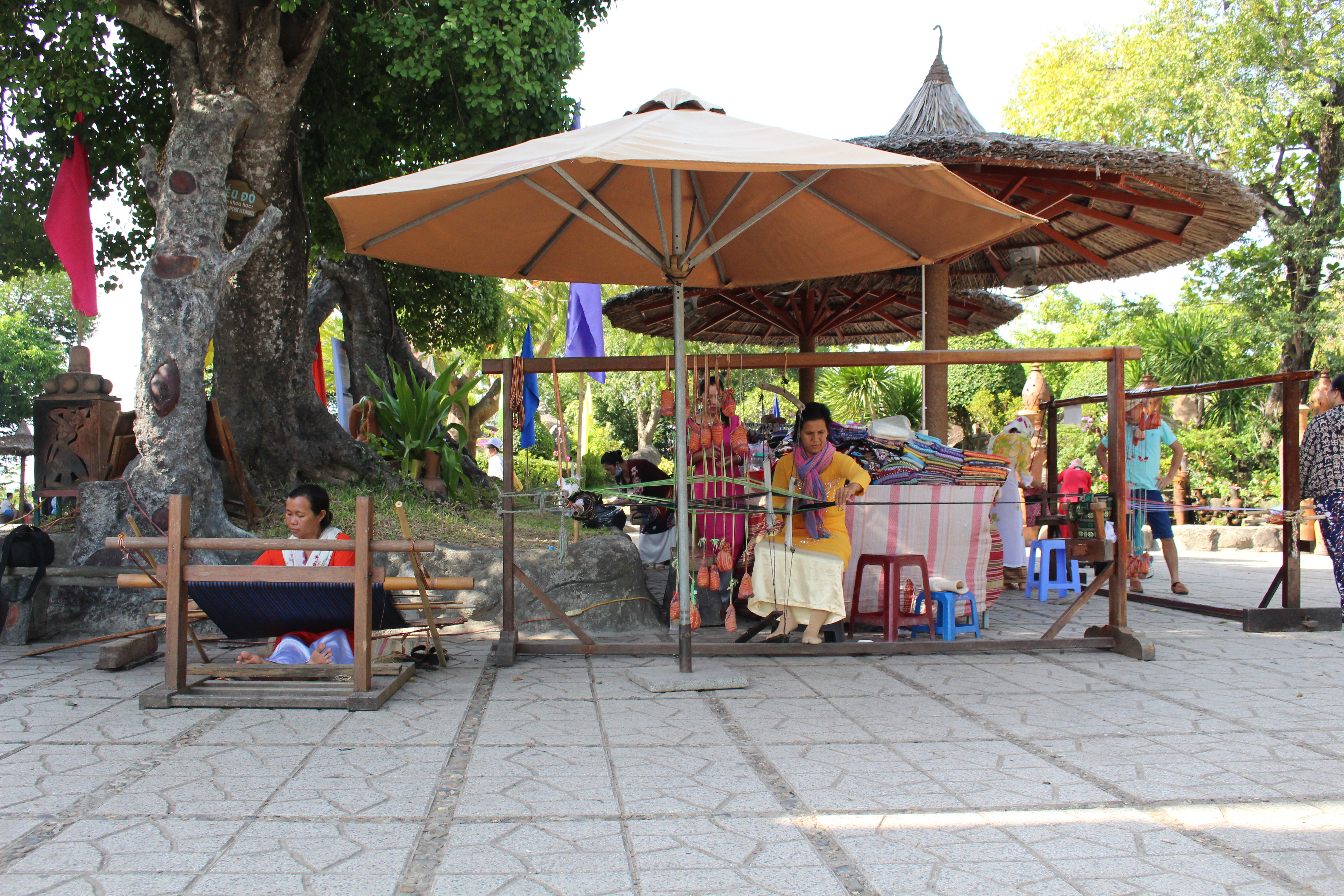 Ngoài biểu diễn làm gốm Bầu Trúc, còn có các nghệ nhân biểu diễn nghề dệt vải truyền thống Mỹ Nghiệp bên nhiều loại khung cửi khác nhau, các sản phẩm dệt được trang trí hoa văn thổ cẩm đa dạng, phong phú không chỉ lưu lại những dấu tích lịch sử, văn hóa mà còn gắn liền với tín ngưỡng, phong tục, tập quán của đồng bào Chăm.
